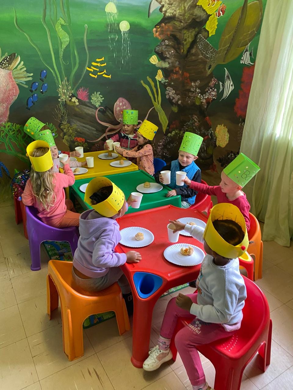 We've been traveling around the world learning about different places, cultures and food. We ate pasta in Italy, sushi in Japan, made fruit sticks from Hawaii, opened a coconut, made masks for a carnival in Brazil and had a tea party in England.